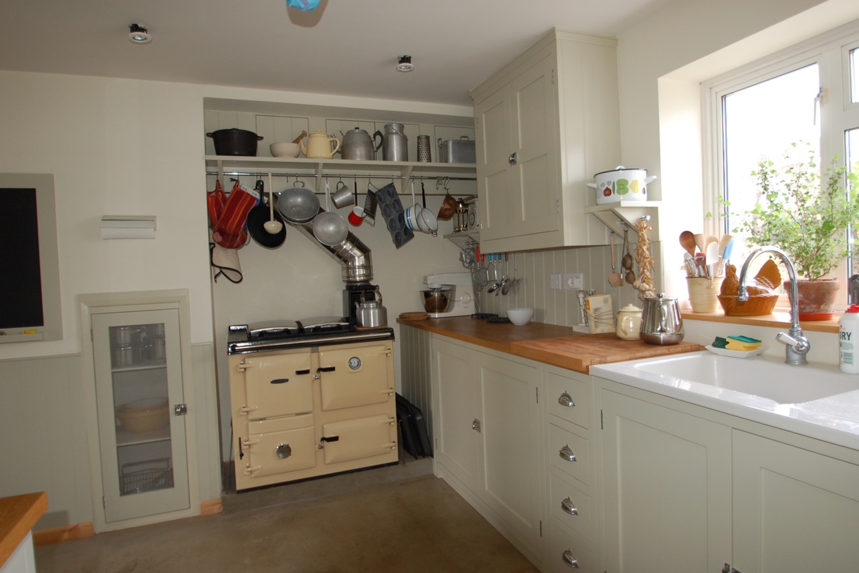 The recess to the left of the Rayburn was a perfect area to create storage for cooking pots. We used a favourite of ours, Chicken Wire, for the door panel. It’s always nice to introduce different materials whenever possible to offer contrast. To finish off we used T&G Bead Panelling for the walls and the area between the worktop and wall cupboards to complement the arrangement.