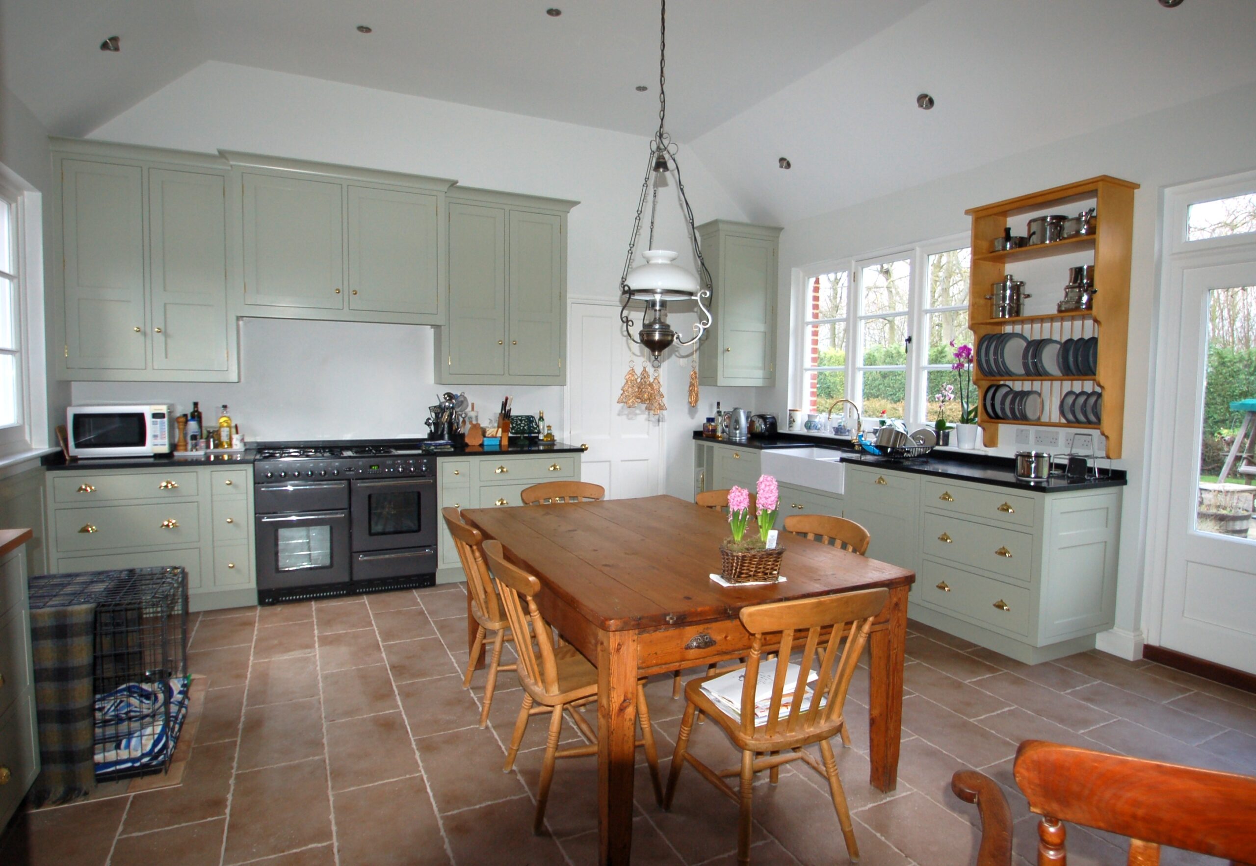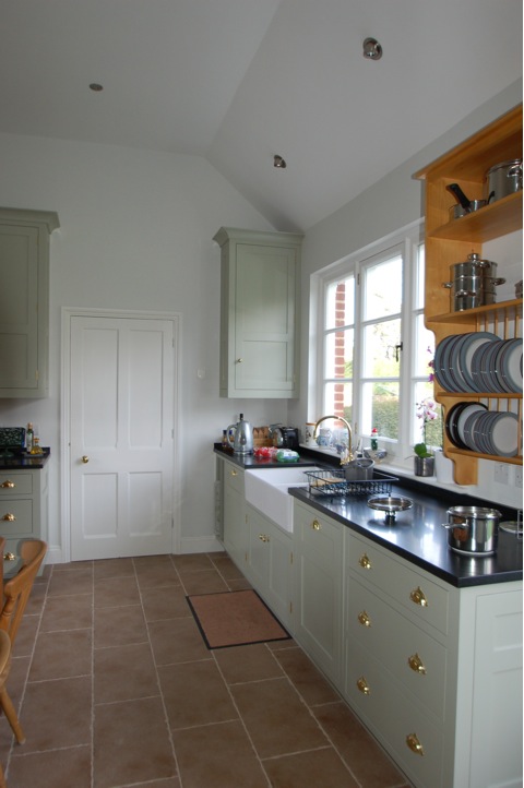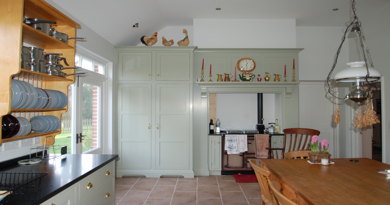 This kitchen is an example of planning a room before building work commences. We were able to plot the exact position of the chimney breast in order to build a tall double door larder to the left and repositioned an internal dorway to gain additional cupboard and worktop space around the Range.