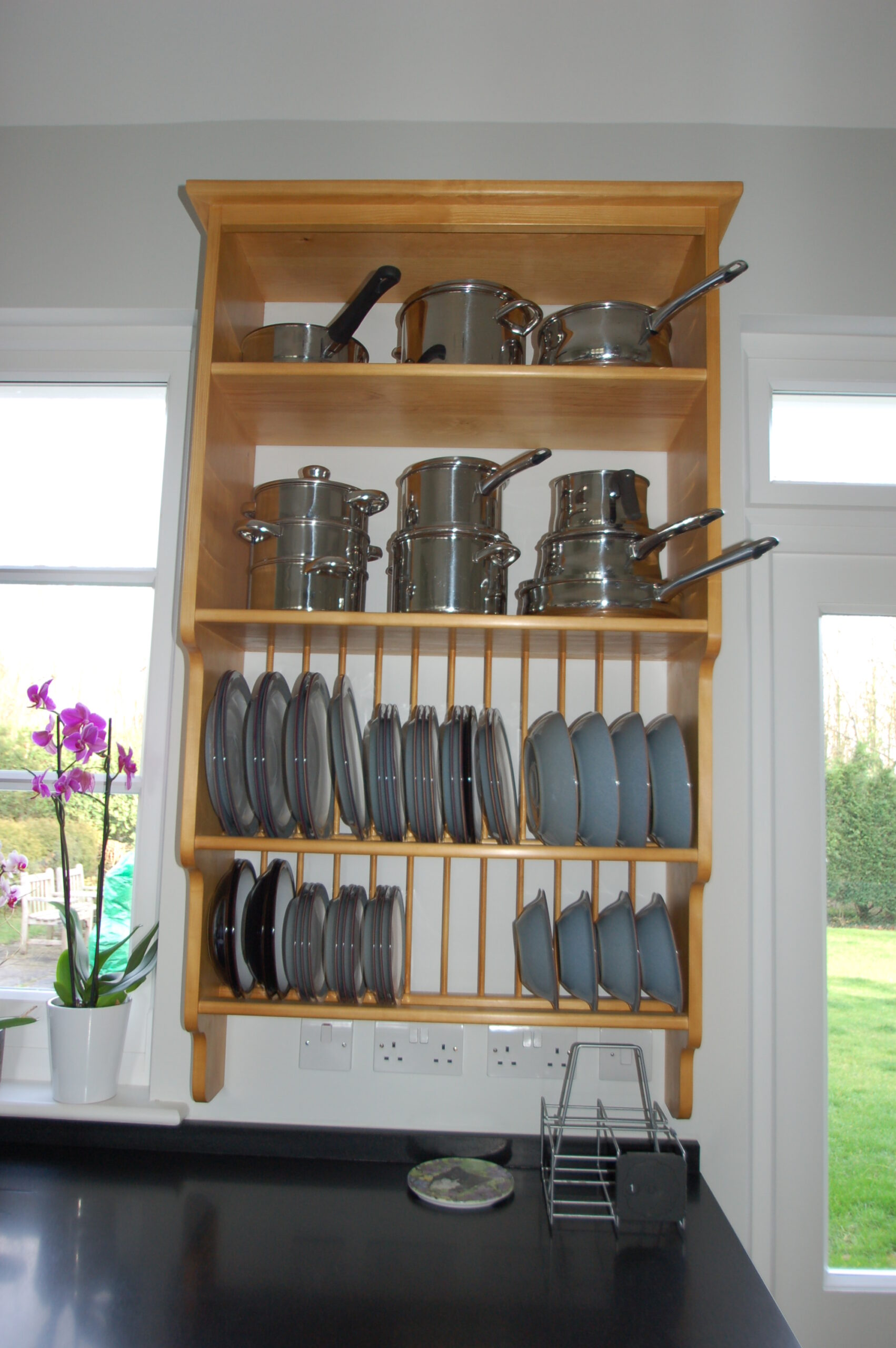 Large Pan drawers sit either side of the Range with smaller drawers above for utensils. Narrow cupboards with pull-out storage for smaller ingredients required during cooking flank the Range. A large drawer cabinet for everyday cutlery and crockery with one of our made-to-measure free-standing Plate Racks above is conveniently located to unload from the Dishwasher.