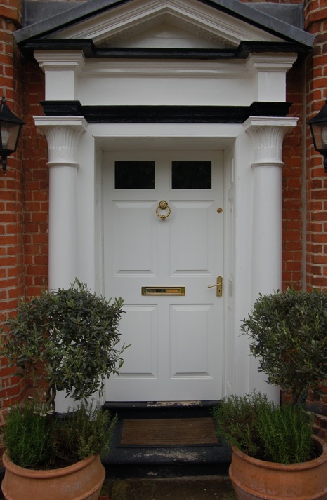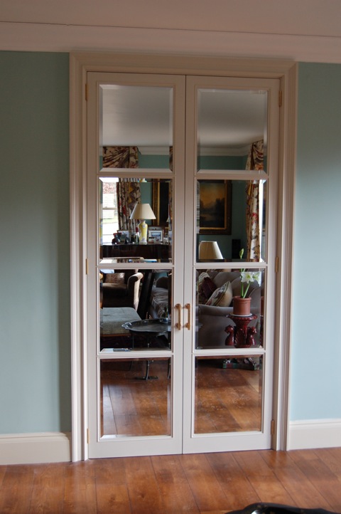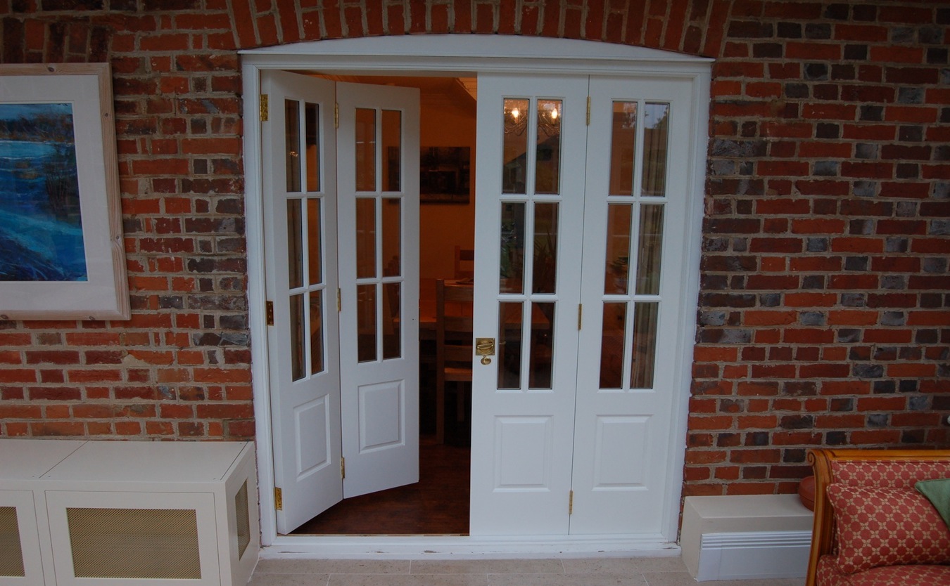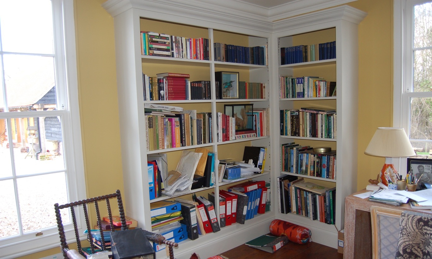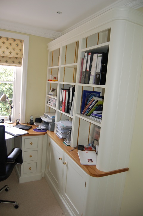 Contrasting colours were used for the cupboards and interiors. The colours chosen not only complemented one another but drew out the wonderful tones in the natural slate floor. The deep red provided a striking contrast to the creamy white cupboards and accentuated the interior of the glazed cupboards.