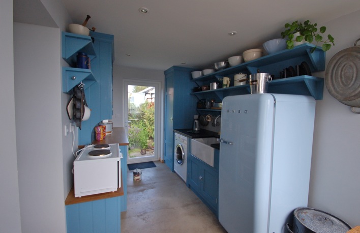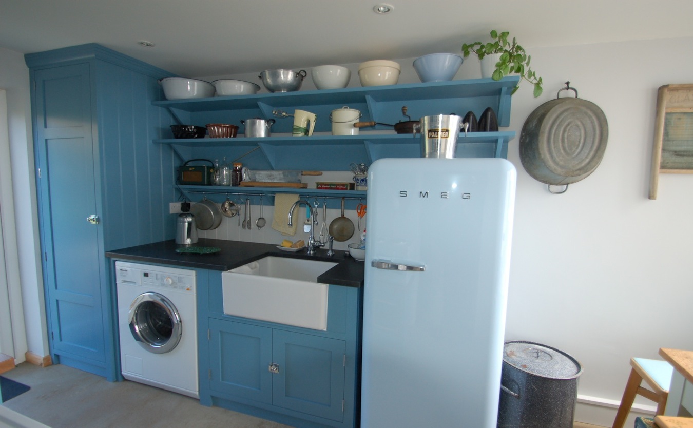 In quite a narrow room it was important not to overburden with solid fronted cupboards, especially on the walls. Our customer’s collection of ceramic bowls and kitchen accessories completed the arrangement.